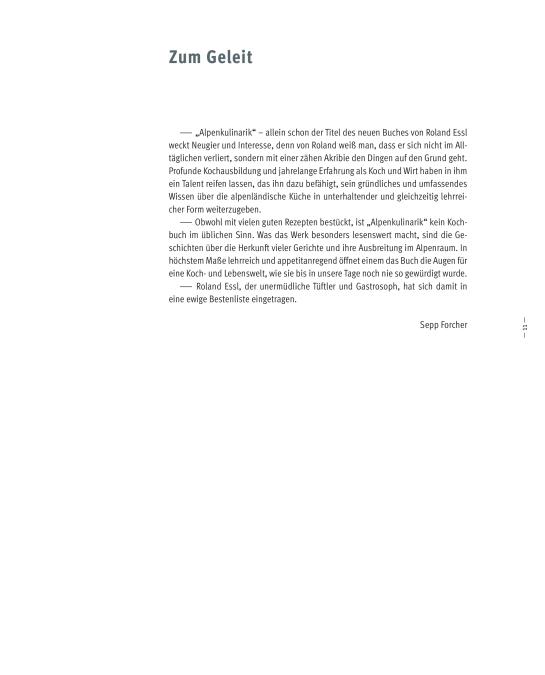 „Was das Werk besonders lesenswert macht, sind die Geschichten über die Herkunft vieler Gerichte und ihre Ausbreitung im Alpenraum. In höchstem Maße lehrreich und appetitanregend öffnet einem das Buch die Augen für eine Koch- und Lebenswelt, wie sie bis in unsere Tage noch nie so gewürdigt wurde. — Roland Essl, der unermüdliche Tüftler und Gastrosoph, hat sich damit in eine ewige Bestenliste eingetragen.“ Sepp Forcher