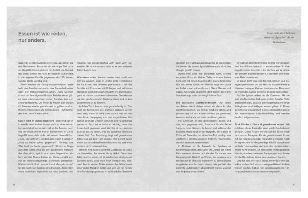 „Authentic Asian Food“ ist mehr als ein Kochbuch. Die Fotos von den Gerichten sowie von Land und Leuten erzählen Geschichten und geben spannende Einblicke in die unterschiedlichen Küchen der ausgewählten Länder. Hintergrundinformationen über deren Esskultur und zu speziellen Zutaten runden das Buch ab.