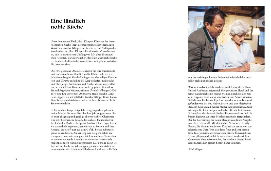 Heute wird der Gasthof in der Familie liebevoll weitergeführt. Willi Klinger hat den Rezeptschatz seiner Mutter gesammelt und kommentiert, von feinen Suppen über deftige Hausmannskost und große Braten bis zu Wildküche und der „Original Klingertorte“. Das Beste daran: Die Rezepte sind ebenso gut wie gelingsicher, viele sind verblüffend einfach und alle gut nachzukochen.