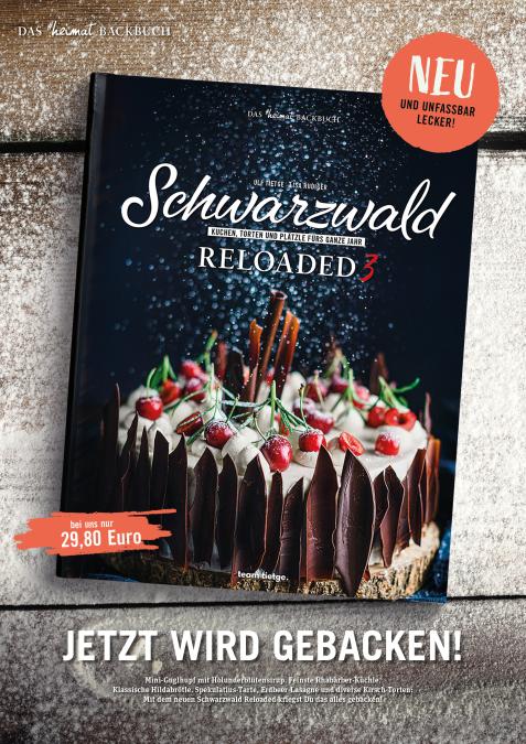Mini-Guglhupf mit Holunderblütensirup. Feinste Rhabarber-Küchle. Klassische Hildabrötle. Spekulatius-Tarte, Erdbeer-Lasagne und diverse Kirsch-Torten: Mit dem neuen Schwarzwald Reloaded kriegst du das alles gebacken!