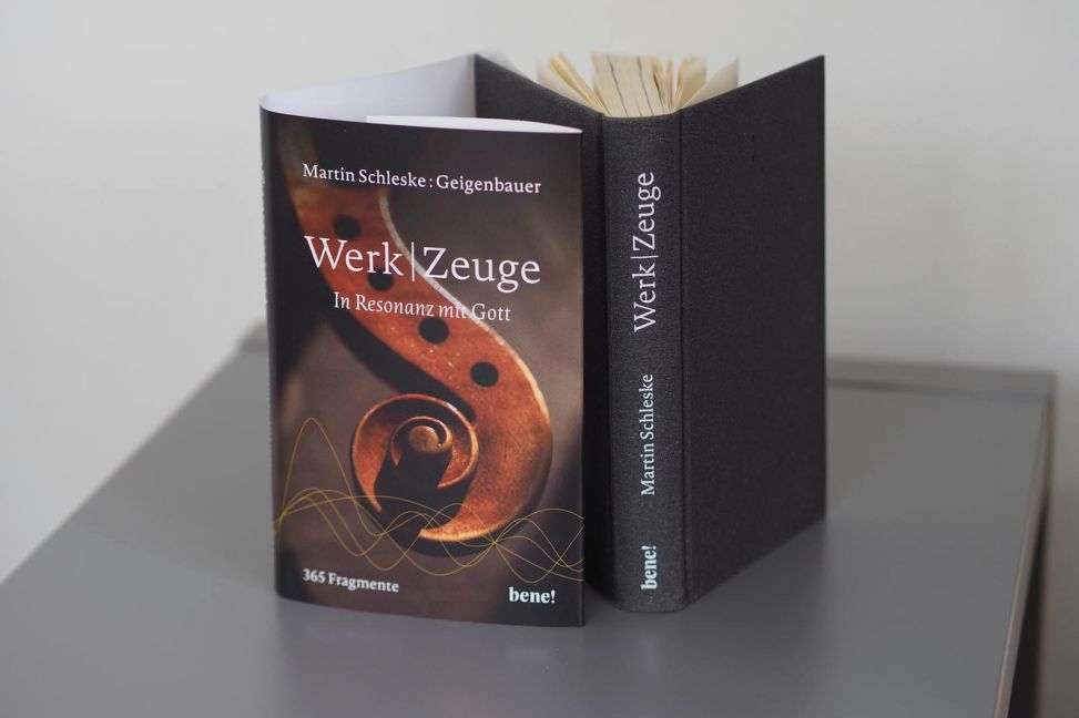Martin Schleske ist aber nicht nur ein hervorragender Handwerker, Wissenschaftler, Schriftsteller, Künstler und Vortragsredner, sondern vor allem auch ein Hörender. In seiner Werkstatt in der Altstadt von Landsberg am Lech hat er in der obersten Etage eine Kapelle eingerichtet. Hier werden von ihm die fertigen Geigen ausprobiert. Aber er zieht sich auch mehrmals täglich zum Meditieren und zum Gebet in diesen Raum zurück. Dort hat er auch sein neues Buch geschrieben. In seinen Texten geht es um die Freude an einem intensiv erlebten Glauben, um Resonanzerfahrungen mit dem Geheimnis Gottes. Zwölf Werkzeuge aus seiner Werkstatt symbolisieren unterschiedliche Themenfelder, denen der Autor nachspürt.