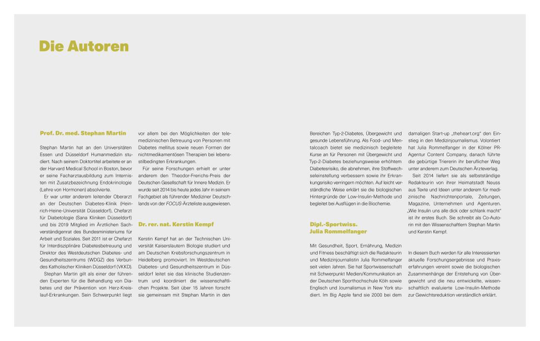 Dr. Kerstin Kempf hat an der Technischen Universität Kaiserslautern Biologie studiert und am Deutschen Krebsforschungszentrum in Heidelberg promoviert. Im Westdeutschen Diabetes- und Gesundheitszentrum in Düsseldorf leitet sie das klinische Studienzentrum und koordiniert die wissenschaftlichen Projekte. Seit über 15 Jahren forscht sie gemeinsam mit Prof. Martin im Bereich Typ 2 Diabetes, Übergewicht und gesunde Lebensführung. Als Food- und Mentalcoach bietet sie medizinisch begleitete Kurse an für Personen mit Übergewicht und Typ 2 Diabetes bzw. erhöhtem Diabetesrisiko, die abnehmen und ihre Stoffwechseleinstellung verbessern bzw. ihr Erkrankungsrisiko verringern möchten. In diesem Buch sollen aktuelle Forschungsergebnisse und Praxiserfahrungen vereint und die biologischen Zusammenhänge der Entstehung von Übergewicht sowie die neu entwickelte, wissenschaftlich evaluierte Low-Insulin-Methode zur Gewichtsreduktion für alle Interessierten verständlich erklärt werden.