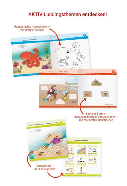 Meer entdecken mit Stift, Schere und Kleber Was kann man bei Ebbe erleben? Wie schwimmen Seepferdchen? Und was macht ein Fischkutter? Spielerisch entdecken die Kinder mit diesem Block erstes Sachwissen rund um das Meer und werden kreativ: Sie kleben Fische in die Unterwasserwelt, malen einen Delfin aus oder rätseln, welches Tier in den Dünen lebt. Zahlreiche Aktivitäten lassen Kinder in ihr Lieblingsthema eintauchen und vermitteln erstes Sachwissen.