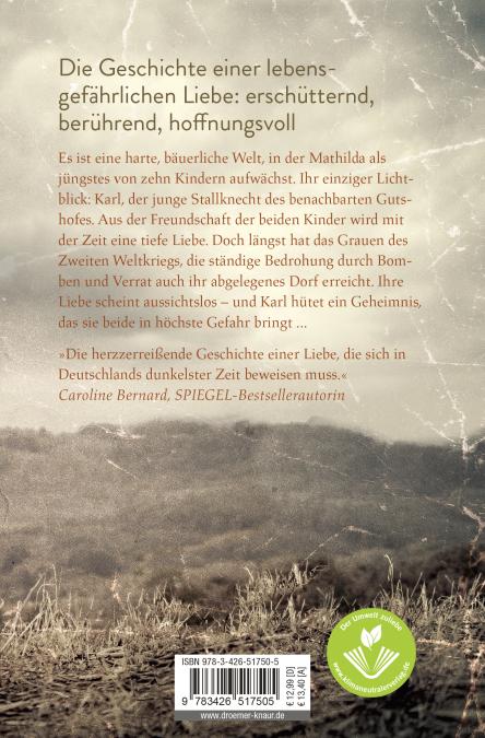 Inspiriert von den Erlebnissen ihrer Großmutter, lässt uns Daniela Ohms die Zeit des Nationalsozialismus und den 2. Weltkrieg aus Sicht der Landbevölkerung erleben: das harte, entbehrungsreiche Leben, das Mathilda als zehntes Kind eines Bauern führt; die Anstrengungen, die der junge Karl unternehmen muss, um seine Abstammung vor den Nazis geheim zu halten; die Liebe der beiden, die nicht sein darf, bringt sie Mathilda doch in große Gefahr; dazu das Grauen des 2. Weltkriegs und die ständige Bedrohung durch Bomben oder Verrat.